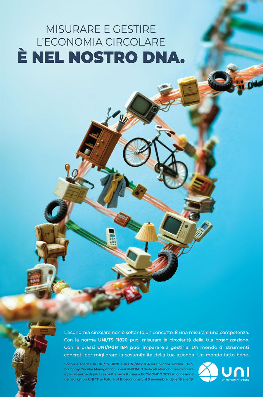 Le ultime novità riguardano il quotidiano “Il Sole 24 Ore”. Lo scorso 5 novembre abbiamo dato spazio, attraverso una pagina pubblicitaria, a un tema di particolare attualità per il mondo della normazione, che vede l’Italia svolgere un ruolo di capofila a livello internazionale: parliamo di economia circolare, e quindi della UNI/TS 11820 sulla misurazione della circolarità, della recentissima UNI/PdR 184 sui profili professionali nell’ambito della circular economy e dei relativi corsi UNITRAIN dedicati.