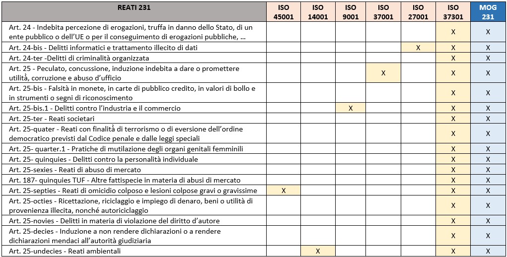 Il beneficio di un sistema di gestione, se adattato ed integrato con le finalità del Modello Organizzativo di Gestione e Controllo, aiuta ad identificare, progettare, implementare e rivedere idonei presidi di controllo che, pur non essendo garanzia assoluta di prevenzione del reato 231, aiuta in modo significativo una Organizzazione a strutturare basi solide per sviluppare il “MOG” e fornire evidenze solide di “adeguatezza” e di “effettività”, fondamentali per potere dimostrare l’esimenza dei Modelli aziendali (vd. Tabella 1).